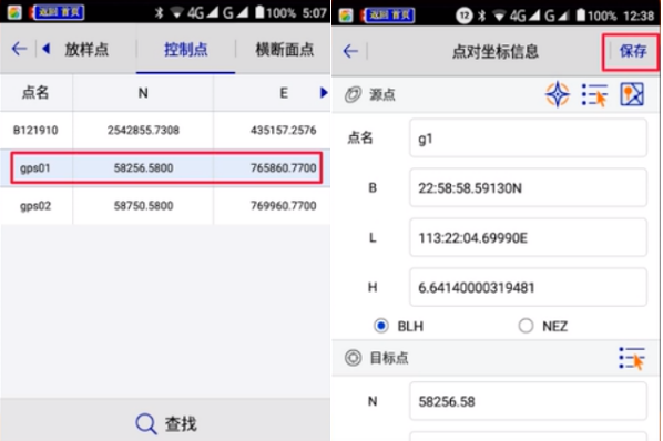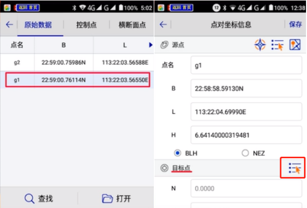 5、原始數(shù)據(jù)庫里選擇[采集點(diǎn)g1],點(diǎn)擊目標(biāo)點(diǎn)后面圖標(biāo),在控制點(diǎn)庫里選擇[采集點(diǎn)GPS01],這樣GPS01的源點(diǎn)和目標(biāo)點(diǎn)的坐標(biāo)匹配完成,點(diǎn)擊【保存】。如圖所示: