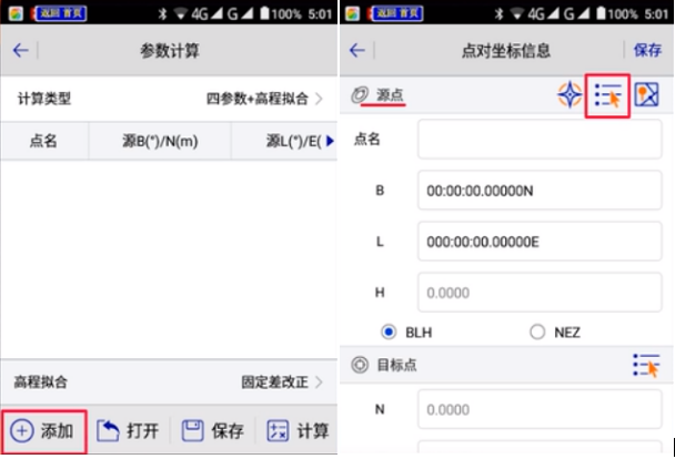 4、點(diǎn)擊【添加】進(jìn)行坐標(biāo)匹配,點(diǎn)擊源點(diǎn)后面中間圖標(biāo),采集數(shù)據(jù)。如圖所示: