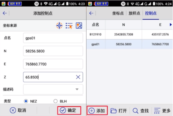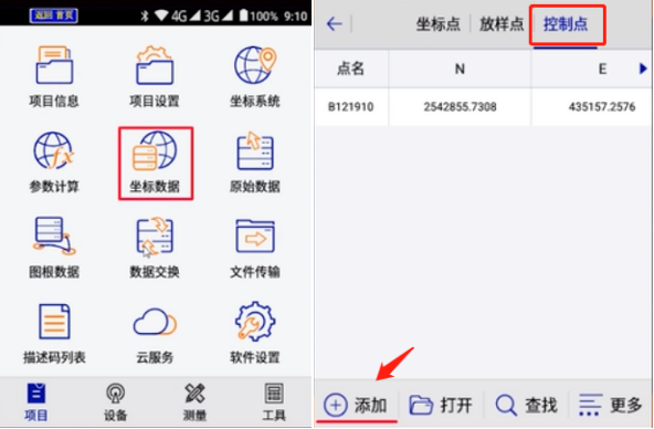 1、進(jìn)入Hi-Survey軟件界面,點(diǎn)擊【項目】-【坐標(biāo)數(shù)據(jù)】,跳轉(zhuǎn)頁面,點(diǎn)擊[【控制點(diǎn)】,在控制點(diǎn)庫里界面點(diǎn)擊【添加】錄入已知點(diǎn)坐標(biāo),如圖所示:
