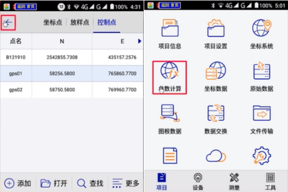 3、控制點(diǎn)坐標(biāo)錄入完畢,點(diǎn)擊返回按鈕。進(jìn)入軟件界面,點(diǎn)擊【項目】-【參數(shù)計算】,如圖所示: