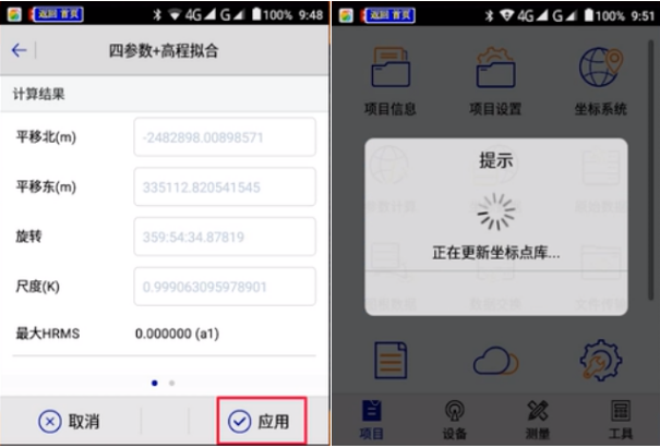 7、點(diǎn)擊參數(shù)解算類型選項,這里選擇【四參數(shù)+高程擬合】-【計算】,四參數(shù)結(jié)果已算出,一般尺度大小接近于“1”,確認(rèn)參數(shù)結(jié)果后,點(diǎn)擊【應(yīng)用】,參數(shù)導(dǎo)入坐標(biāo)系統(tǒng)中,參數(shù)計算完畢。如圖所示:(注:若需要查看參數(shù)應(yīng)用情況,可點(diǎn)擊“坐標(biāo)系統(tǒng)”查看)。