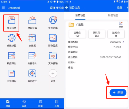 1、進入Hi-Survey軟件界面,點擊右下角【項目】-【項目信息】,進入新建項目頁,點擊藍色懸浮【新建】按鈕,如圖所示: