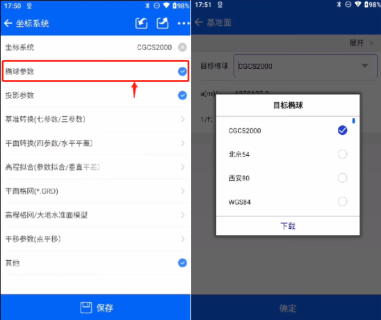 5、點開【橢球參數(shù)】選項,點擊【目標橢球】,這里默認CGCS2000,如圖所示: