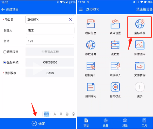 4、填完信息,點擊【確定】。返回Hi-Survey軟件界面,點擊【坐標系統(tǒng)】,如圖所示:
