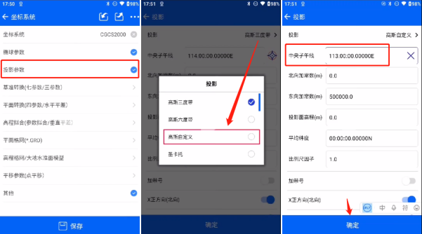 6、點開【投影參數(shù)】選項,點擊【投影】,選擇【高斯自定義】,選中“中央子午線設置”,改為113度,然后點擊【確定】,如圖所示: