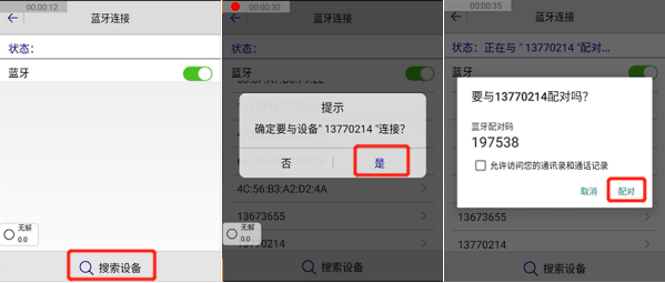 2、搜索頁面點擊【底部搜索按鈕】,查找附近藍(lán)牙設(shè)備,選擇對應(yīng)的主機(jī)機(jī)身號,點擊【是】-【配對】,進(jìn)行藍(lán)牙配對連接。如圖所示: