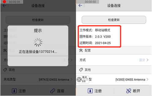 3、手簿軟件與對應(yīng)主機(jī)藍(lán)牙進(jìn)行配對匹配與連接,連接成功后可查看主機(jī)對應(yīng)的固件版本信息、過期時間等信息。如圖所示: