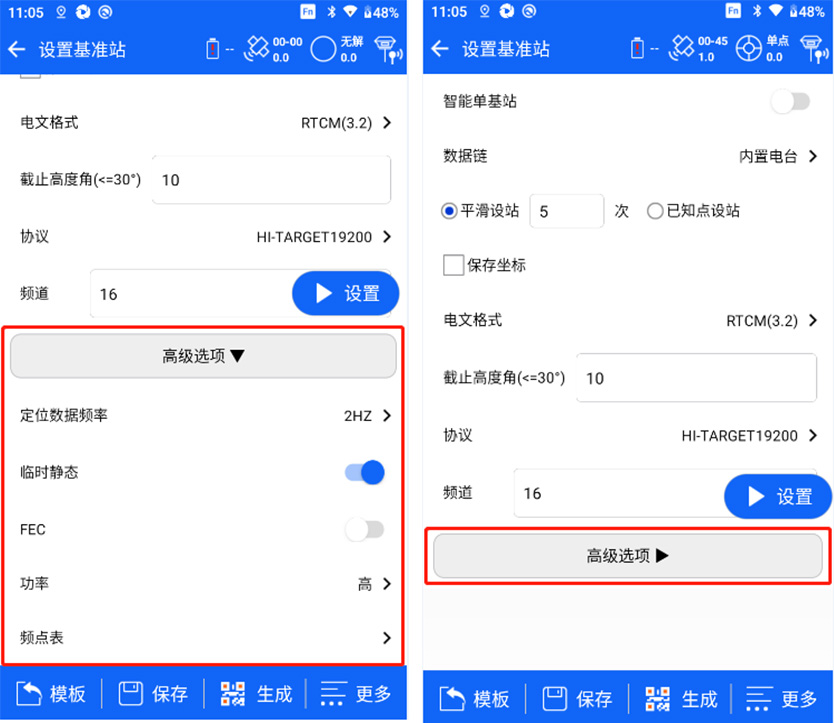 接著設(shè)置基準(zhǔn)站—先設(shè)置基準(zhǔn)站“接收機(jī)”位置,勾選是否保存基站坐標(biāo),再設(shè)置 “電文格式”、“截止高度角”、“數(shù)據(jù)鏈”;并且可以通過“高級選項(xiàng)”設(shè)置“定位數(shù)據(jù)頻率’、“臨時(shí)靜態(tài)”等。