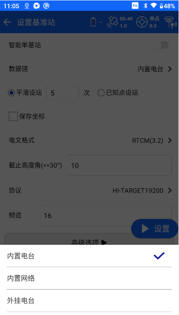 ?、谌绻鶞?zhǔn)站架設(shè)在未知點(diǎn)上,選擇【平滑設(shè)站】,設(shè)置平滑次數(shù);完成數(shù)據(jù)鏈、電文格式等設(shè)置后,點(diǎn)擊懸浮按鈕“設(shè)置”接收機(jī)將會(huì)按照設(shè)置的平滑次數(shù)進(jìn)行平滑,最后取平滑后的均值為基準(zhǔn)站坐標(biāo)。另外,平滑設(shè)站若勾選“保存坐標(biāo)”,則還需輸入該坐標(biāo)的目標(biāo)高、選擇量高類型,輸入點(diǎn)名。