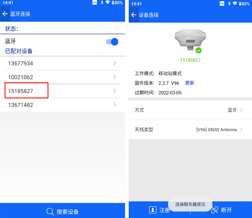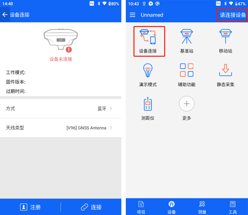首先找到【設(shè)備】→點(diǎn)擊【設(shè)備連接】或直接點(diǎn)擊右上角“請連接設(shè)備”進(jìn)入設(shè)備連接界面,點(diǎn)擊“連接”→選擇基準(zhǔn)站的機(jī)號進(jìn)行藍(lán)牙配對連接。