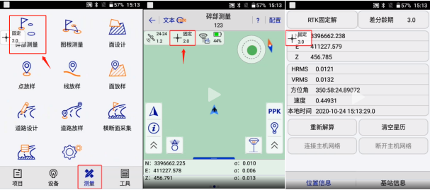 1、進(jìn)入Hi-Survey軟件界面,點(diǎn)擊【測(cè)量】-【碎部測(cè)量】,進(jìn)入界面,點(diǎn)擊【固定】,當(dāng)顯示固定后才可以采集坐標(biāo)。如圖所示: