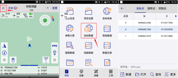 3、返回碎部測(cè)量頁(yè)面,點(diǎn)擊【返回鍵】,進(jìn)入Hi-Survey軟件界面,點(diǎn)擊【項(xiàng)目】-【坐標(biāo)數(shù)據(jù)】,即可查看測(cè)量坐標(biāo)點(diǎn)。如圖所示:
