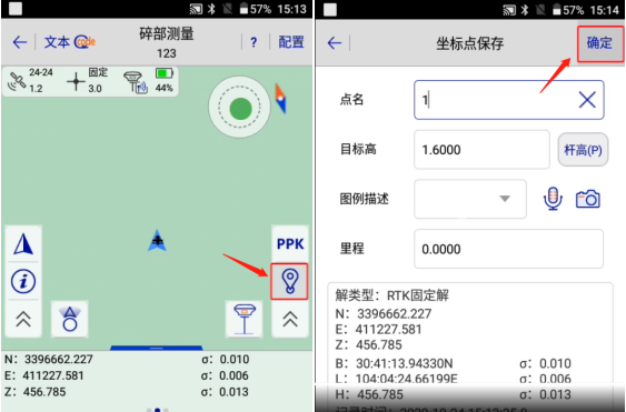 2、點(diǎn)擊右下角【浮動(dòng)采集標(biāo)】,進(jìn)入坐標(biāo)點(diǎn)界面,輸入【點(diǎn)名】-【目標(biāo)高】-【目標(biāo)高類型】- 點(diǎn)擊【確定】,同理采集2號(hào)點(diǎn)。如圖所示: