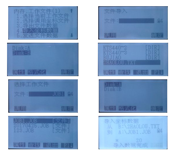 2、然后打開全站儀,依次按鍵操作“內存→工作文件→導入坐標數據→選擇工作文件→選擇 U盤中的文件→按 ENT 鍵”導入坐標數據即可。如圖所示: