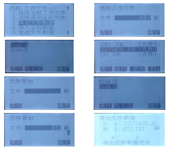 2、然后打開全站儀,依次按鍵操作“內存→工作文件→導出文件數據→選擇工作文件→確定”。