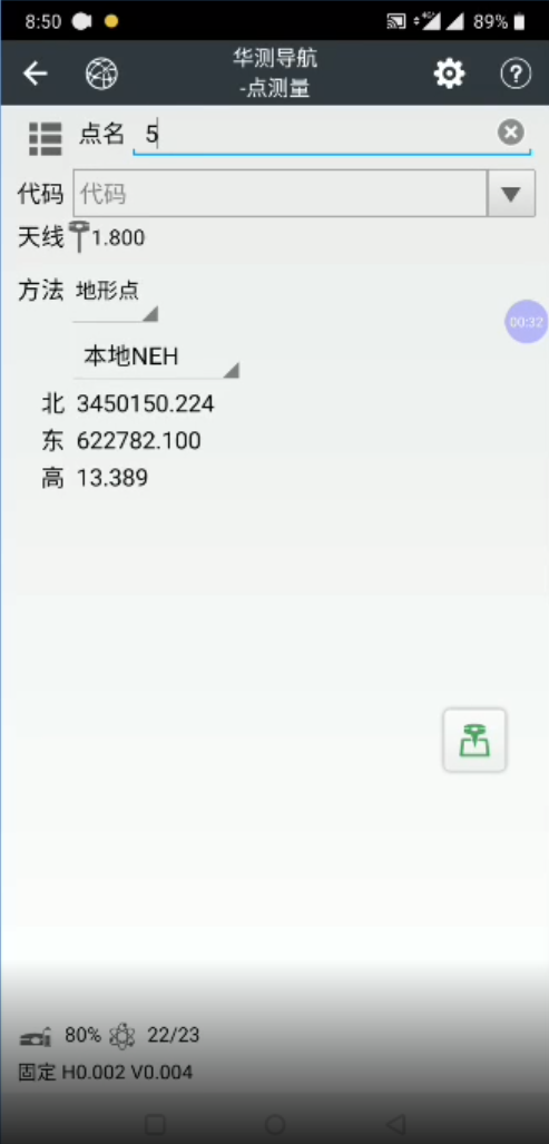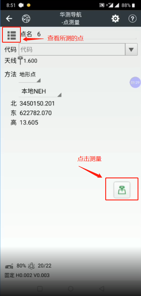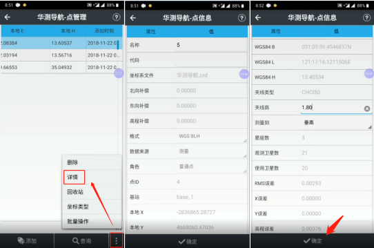 5、點擊右下角【...】可查看點詳情,如有需要,可修改點名和天線高,修改完畢,點擊確定,完成測量。如圖所示: