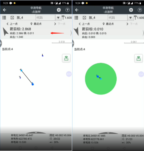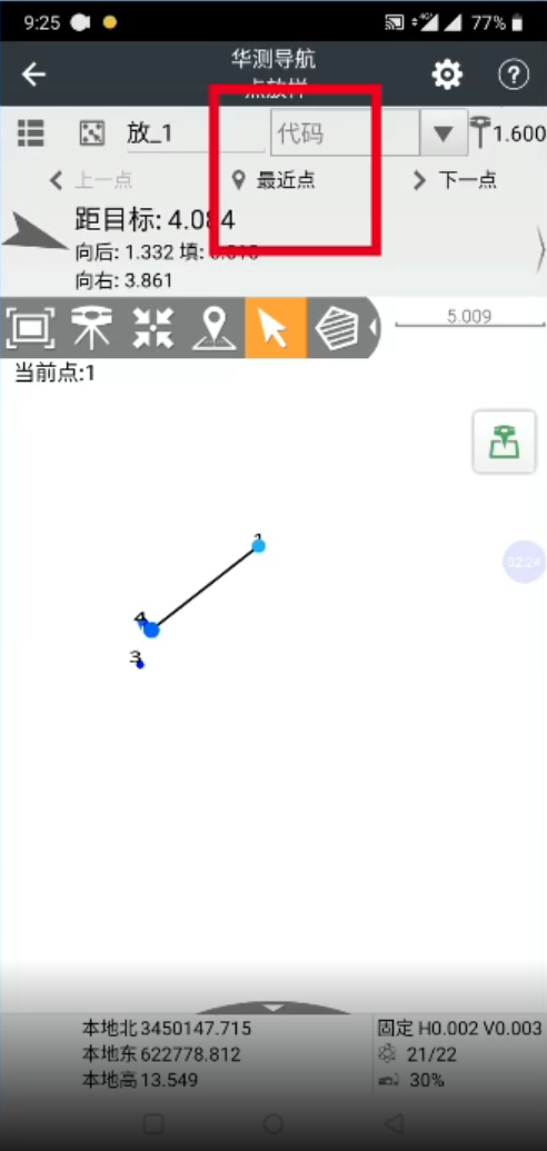 3、回到點放樣界面,滑動屏幕可切換距離指示的方式,按箭頭指示方向前進,即可找到目標點,當(dāng)聽到語音提示和看到綠色標志時,證明找到點位。如圖所示: