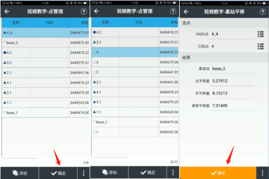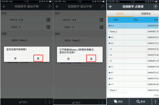 5、是否應(yīng)用平移參數(shù)選擇【是】,是否打開點(diǎn)庫選擇【是】,點(diǎn)坐標(biāo)相匹配則基站平移完成。