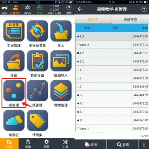 2、返回軟件界面,找到下方項(xiàng)目選項(xiàng),點(diǎn)擊【項(xiàng)目】-【點(diǎn)管理】,如果基站發(fā)生了變化,需要做基站平移,如圖所示: