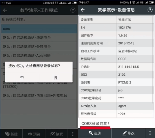 5、選中新建好的工作模式,點擊右下角【接受】- 是否接受此模式選擇【是】- 接收成功,去檢查網(wǎng)絡(luò)登錄狀態(tài)選擇【是】,可在設(shè)備信息查看是否登錄成功,若顯示“CORS登錄成功”,則設(shè)置完成了,如圖所示: