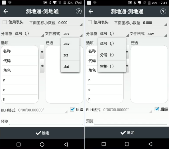 2、點(diǎn)擊【自定義】,可以改變平面坐標(biāo)小數(shù)點(diǎn)的位數(shù),點(diǎn)擊修改【分隔符】和【文件格式】。如圖所示: