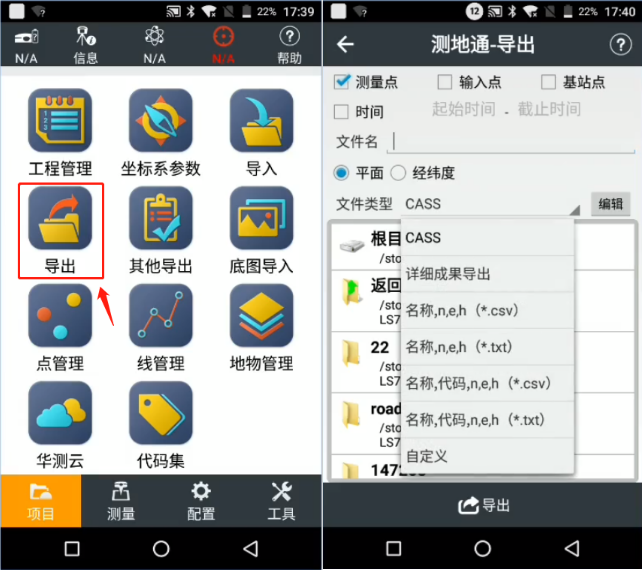 1、進(jìn)入LandStar7版軟件界面,找到下方項(xiàng)目選項(xiàng),點(diǎn)擊【項(xiàng)目】-【導(dǎo)出】,選擇“測量點(diǎn)”,導(dǎo)出類型這里以“平面”為例,點(diǎn)擊文件類型,通過自定義來增加需要的數(shù)據(jù)格式,如圖所示:
