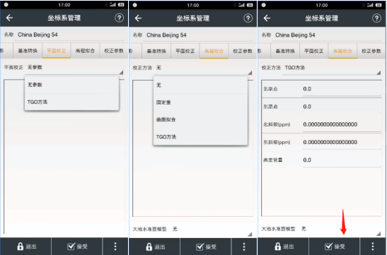 ④點(diǎn)校正參數(shù)在“平面校正”和“高程擬合”里查看。設(shè)置完畢后,點(diǎn)擊右下角【接受】,如圖所示: