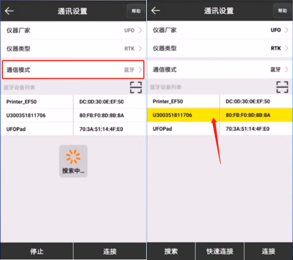 2、點(diǎn)擊“通信模式”- 選擇【藍(lán)牙】,藍(lán)牙設(shè)備列表顯示“搜索中”,直到搜索到需要連接的儀器,點(diǎn)擊停止。選中需要連接的儀器,再點(diǎn)擊左下角連接。如下圖:
