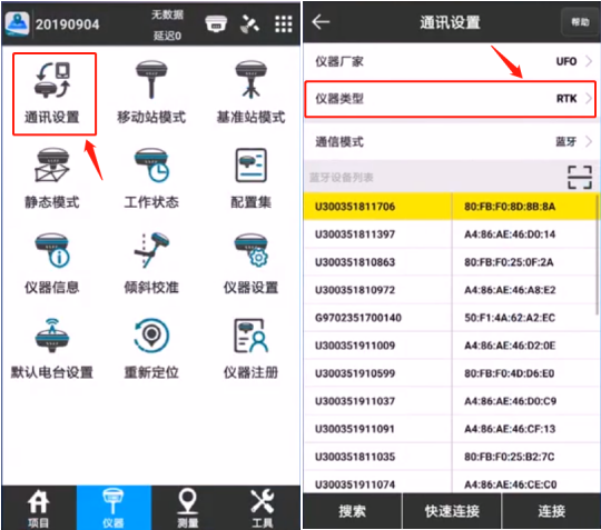 1、打開手簿,運(yùn)行UFOPad專業(yè)版測(cè)量軟件,進(jìn)入主菜單,點(diǎn)擊【儀器】-【通訊設(shè)置】,進(jìn)入“通訊設(shè)置”頁面,點(diǎn)擊“儀器類型”選擇【RTK】,如下圖: