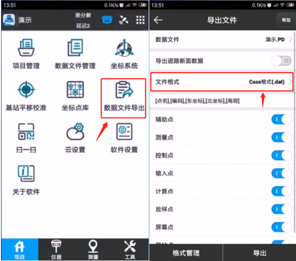 1、打開手簿,運(yùn)行UFOPad專業(yè)版測量軟件,進(jìn)入主菜單,點(diǎn)擊【項(xiàng)目】-【數(shù)據(jù)文件導(dǎo)出】,進(jìn)入“導(dǎo)出文件”頁面,點(diǎn)擊“文件格式”,向下滑動(dòng)選擇需要導(dǎo)出的格式。如圖所示: