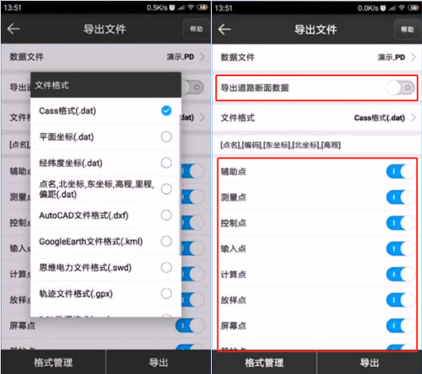 2、導(dǎo)出文件中可以勾選導(dǎo)出道路斷面并選擇斷面格式(注:部分格式不支持選擇導(dǎo)出斷面,需要額外選擇斷面格式),也可以點(diǎn)擊下面的開關(guān)篩選導(dǎo)出的點(diǎn)類型,如圖所示: