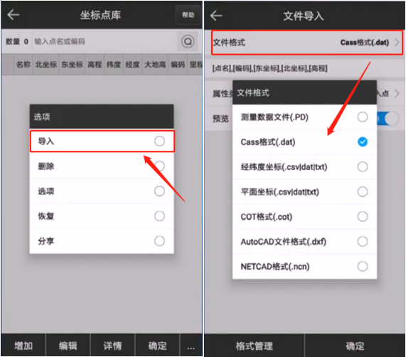 2、點擊完畢后,頁面彈出5個選項,選擇第一個“導入”選項,頁面跳轉到文件導入,點擊“文件格式”,選擇需要導入的文件格式,此處以Cass(.dat)格式為例。如圖所示: