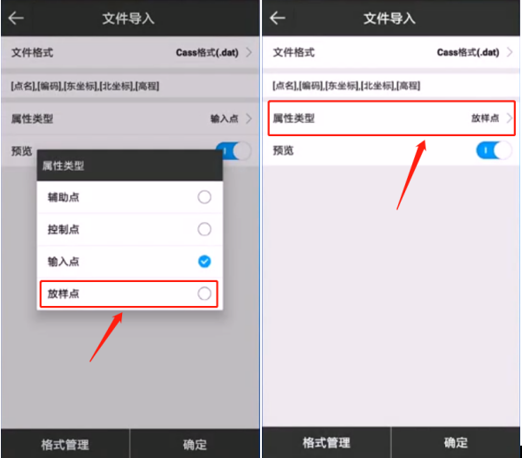 3、點擊屬性類型,出現(xiàn)4種類型,可以選擇導入點的類型,如:控制點、放樣點等。這里我們選擇類型為【放樣點】,點擊右下角【確定】。如圖所示: