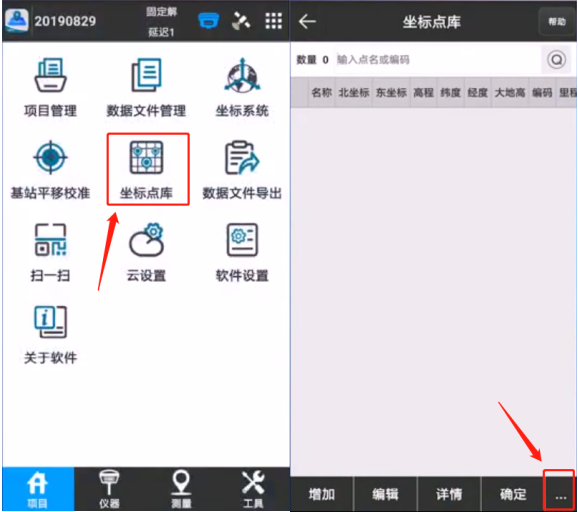 1、打開手簿,運行UFOPad專業(yè)版測量軟件,進入主菜單,點擊【項目】-【坐標點庫】,自動跳轉到坐標點庫頁面,點擊右下角【...】,如圖所示: