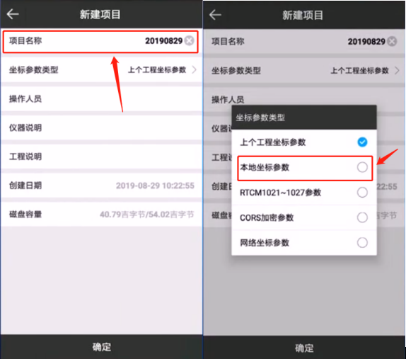 2、進(jìn)入新建項目界面,輸入“項目名稱”,點擊【坐標(biāo)參數(shù)類型】,將坐標(biāo)參數(shù)類型選擇為“本地坐標(biāo)參數(shù)”。如圖所示: