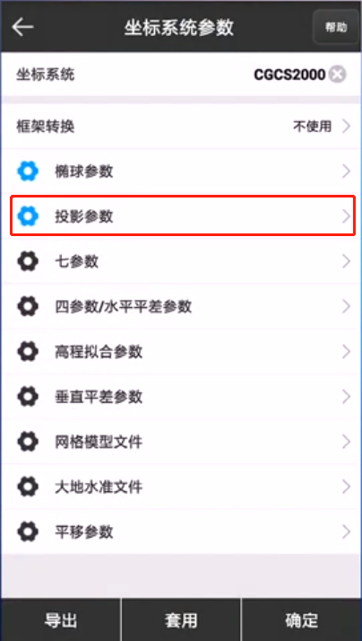 3、選擇完畢后,點擊【確定】進(jìn)入投影參數(shù)頁面(投影方式默認(rèn)為高斯投影),點擊【中央子午線】,可以自動獲取當(dāng)?shù)刂醒胱游缇€(前提是手簿連接儀器),設(shè)置完成后,點擊【確定】。如圖所示: