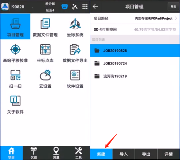 1、打開手簿,運行UFOPad專業(yè)版測量軟件,進(jìn)入主菜單,點擊【項目】-【項目管理】,進(jìn)入項目管理界面,點擊左下角【新建】,如圖所示: