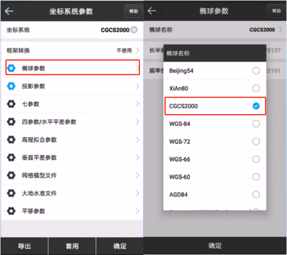 4、進(jìn)入坐標(biāo)系統(tǒng)參數(shù)頁面,點擊【橢球參數(shù)】,可以將橢球參數(shù)修改為自己想要設(shè)置的參數(shù),然后再點擊【橢球名稱】,頁面自動彈出選項,向下方滑動選擇“CGCS2000”(注:這里選擇國家2000,當(dāng)不清楚目標(biāo)橢圓時,默認(rèn)國家2000即可)。如圖所示: