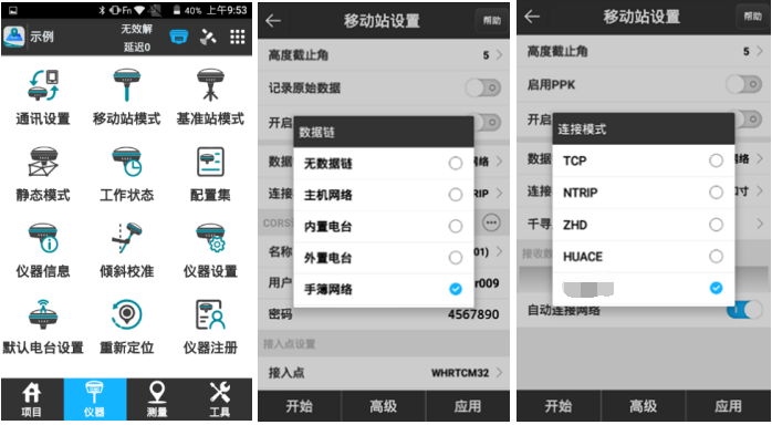 執(zhí)行[儀器] ->[移動站模式] , 數(shù)據(jù)鏈模式選擇[手簿網(wǎng)絡] , 設置好CORS服務器的IP和端口,獲取并選擇接入點,其他選項可以使用默認數(shù)值,點擊[應用],工作模式設置完畢。返回主界面可以查看是否得到固定解。得到固定解后,可以進行下一步操作。