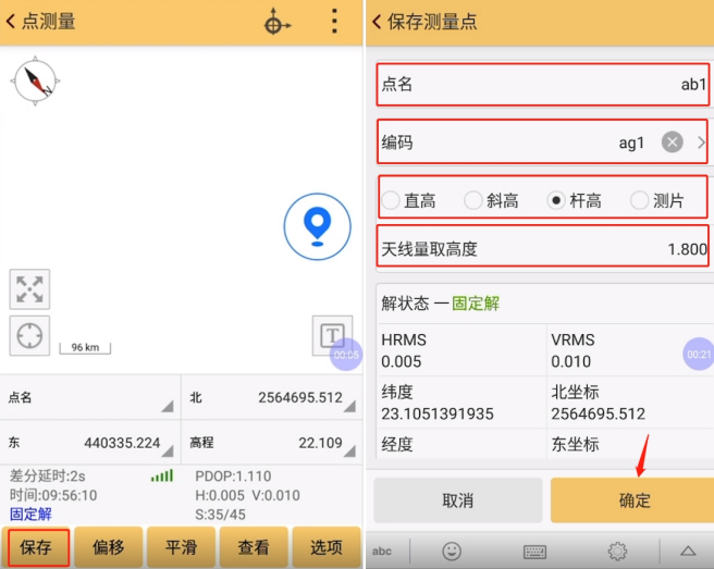2、進(jìn)入點(diǎn)測(cè)量頁(yè)面,點(diǎn)擊左下角【保存】,進(jìn)入保存測(cè)量點(diǎn)頁(yè)面,輸入【點(diǎn)名】、【編碼】、選擇【桿高】、輸入【天線量取高度】,點(diǎn)擊【確定】,返回界面,即可完成該點(diǎn)的采集。如圖所示: