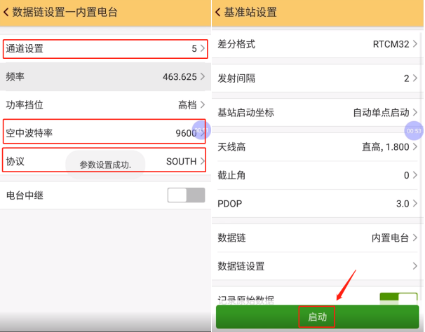 3、設(shè)置好電臺通道-【通道設(shè)置】、【波特率】、【電臺協(xié)議】,設(shè)置完畢后,返回基準(zhǔn)站設(shè)置界面,點擊【啟動】,完成基準(zhǔn)站配置。如圖所示:
