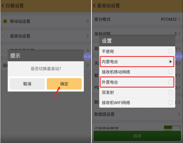 2、進(jìn)入儀器設(shè)置頁面,選擇【基準(zhǔn)站設(shè)置】,進(jìn)入數(shù)據(jù)鏈選擇界面,作為電臺工作模式時,數(shù)據(jù)鏈選擇有兩種,這里以內(nèi)置電臺為例,選擇【內(nèi)置電臺】,如圖所示: