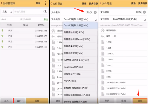 3、進入坐標(biāo)管理庫界面,點擊【導(dǎo)出】,進入文件導(dǎo)出界面,輸入【文件名】,選擇文件類型,點擊【確定】,如圖所示:
