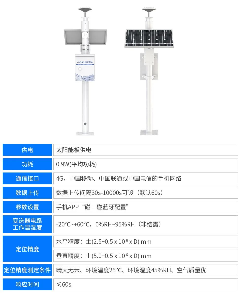 GNSS 位移監(jiān)測(cè)站主要由 GNSS 天線(xiàn)、太陽(yáng)能電池板、主控制機(jī)箱(內(nèi)有主控傳輸模塊)和安裝支架組成,設(shè)備分為基準(zhǔn)站和測(cè)量站,采用了RTK差分定位技術(shù),可以根據(jù)測(cè)量出的已知位置的衛(wèi)星到監(jiān)測(cè)站之間的距離,再綜合多顆衛(wèi)星的數(shù)據(jù),就能得出位移變化的具體位置。