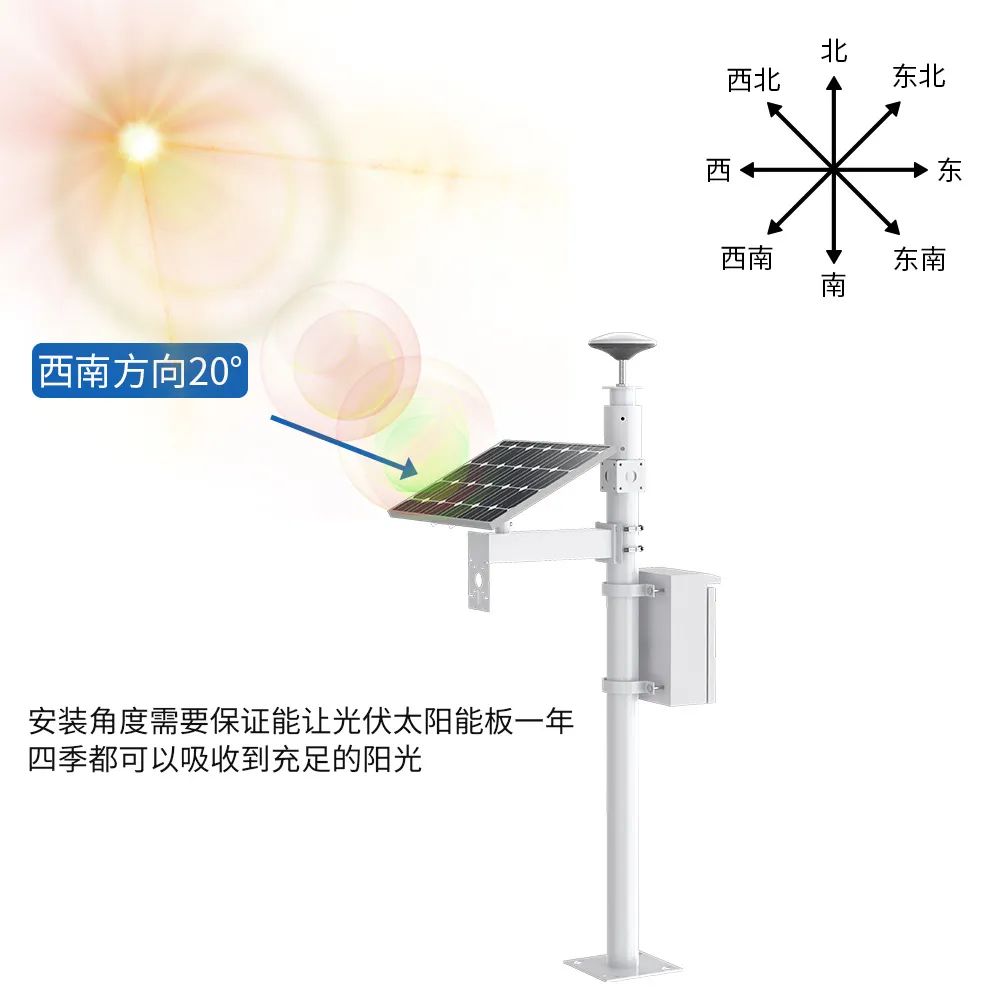 其次考慮方位朝向。經(jīng)過(guò)科學(xué)考證,光伏太陽(yáng)能板在正南時(shí)發(fā)電效率非常高,所以在安裝時(shí)要將其控制在正南方向左右。因?yàn)镚NSS位移監(jiān)測(cè)站年復(fù)一年的在戶(hù)外工作,一年四季光照范圍不同,需要綜合考慮,經(jīng)驗(yàn)證,光伏太陽(yáng)能板的安裝角度最好控制在西南方向20°之內(nèi)(因?yàn)檫@個(gè)角度無(wú)論是夏季還是冬季都能讓光伏太陽(yáng)能板吸收到足夠的光照),以確保設(shè)備續(xù)航無(wú)憂(yōu)。
