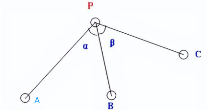 后方交會法:在待測點(P)上架站,通過使用三個己知點(A,B,C)及α角和β角計算待測點(P)坐標的方法。如下圖所示,紅色字母代表的站點為架站點(P):