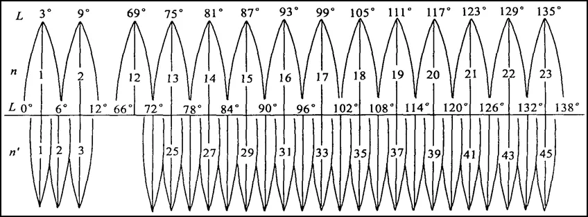 在我國使用的高斯-克呂格投影中,每個投影帶投影面上的中央子午線和赤道的投影都是直線,中央子午線投影后長度不變。以中央子午線和赤道的交點作為坐標原點,以中央子午線的投影為縱軸,以赤道的投影為橫軸,建立該投影帶的平面直角坐標系。高斯投影6°帶自0°子午線起每隔經(jīng)差6°自西向東分帶,帶號按1至60連續(xù)編號。我國6°帶中央子午線的經(jīng)度,由75°起每隔6°而至135°,共計11帶(13~23帶),帶號用n表示,中央子午線的經(jīng)度用L0表示,它們的關系是L0=6n-3。高斯投影3°帶的中央子午線一部分同6°帶中央子午線重合,一部分同6°帶的分界子午線重合,3°帶中央子午線經(jīng)度和帶號的關系L0=3n。我國3°帶共計22帶(24~45帶)。
