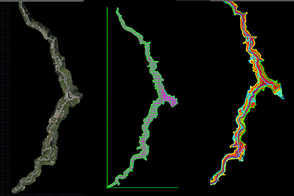 RTK與無人機(jī)在雅安天全某水電站庫容加地形測量中的應(yīng)用,本項(xiàng)目采用RTK,并大量使用大疆M300RTK+LI進(jìn)行仿地飛行,保證精度,防撞山。特殊地帶采用繞飛或手動(dòng)飛行,事后動(dòng)態(tài)差分處理,并全線布設(shè)檢查點(diǎn)驗(yàn)證精度。